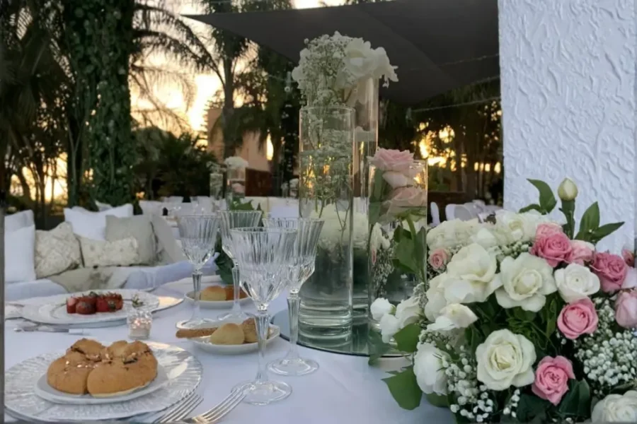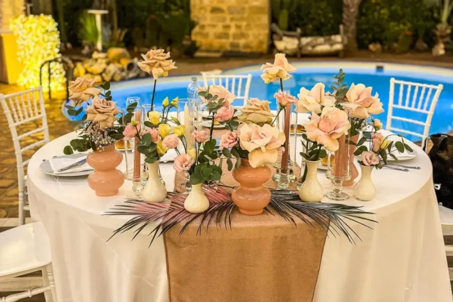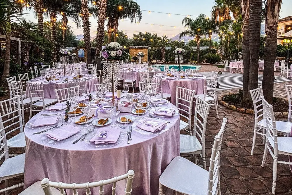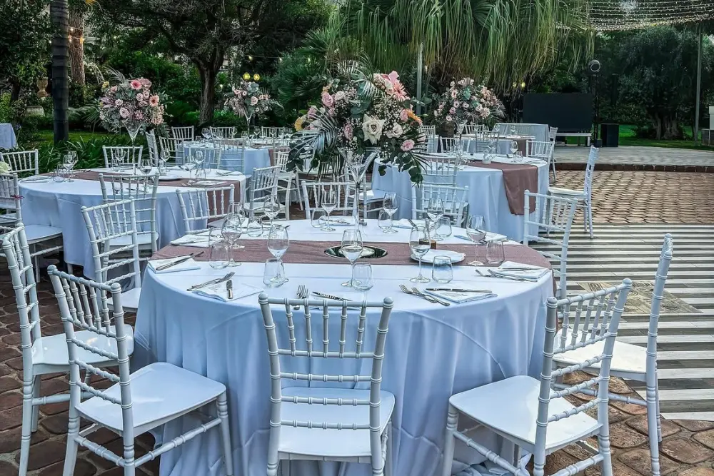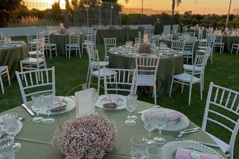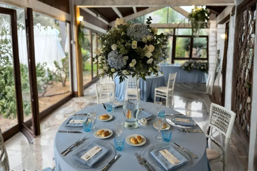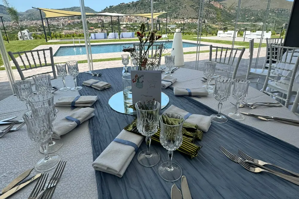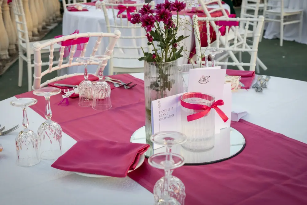 Ogni tavolo è pensato come una piccola scenografia. I colori si armonizzano con la location e con la luce naturale, i materiali si scelgono con cura – dal tessuto delle tovaglie alla lucentezza dei bicchieri – e ogni dettaglio, dal fiore al segnaposto, racconta una storia.