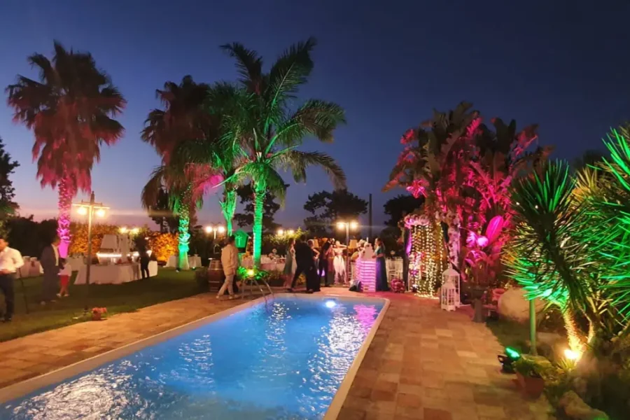 La terrazza panoramica e il giardino con piscina offrono scorci suggestivi per il taglio della torta o l’aperitivo al tramonto.